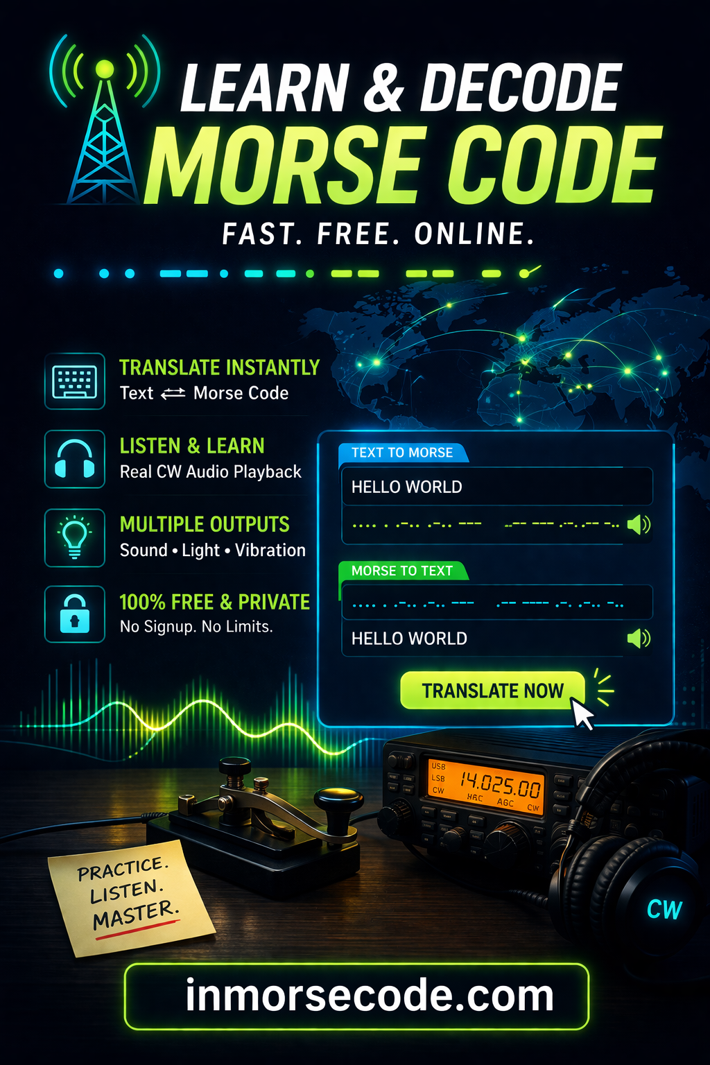 InMorse Code bir bağlantı paylaştı & şudur Arıyor Amateur Radio Operators , Students & Hobbyists, Emergency Preppers, Teachers & Puzzle DesignersInMorseCode.com is a free online Morse code translator. Convert text to Morse, decode Morse to text, and listen to audio. No signup. 100% private. Learn or use Morse code in seconds.