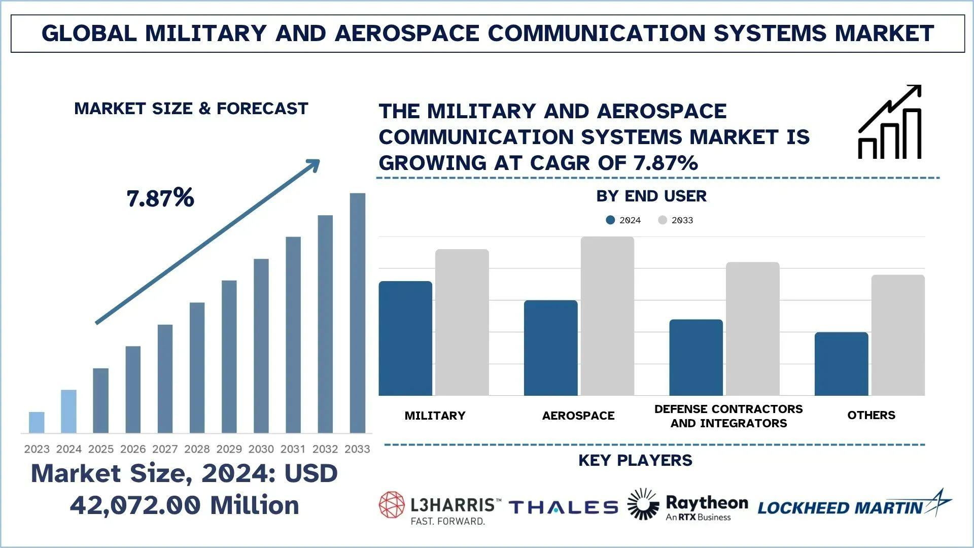 According to UnivDatos analysis, growing military modernization programs, rising demand for secure and encrypted communication, expansion of satellite-based communication systems, integration of AI and machine learning, increasing adoption of fiber-optic networks, rising use of cloud and edge computing, and growing focus on multi-domain operations are the major factors driving the growth of the Military and Aerospace Communication Systems market. As per their “Military and Aerospace Communication Systems Market” report, the global market was valued at USD 42,072.00 million in 2024, growing at a CAGR of about 7.87% during the forecast period from 2025 - 2033 to reach USD million by 2033.