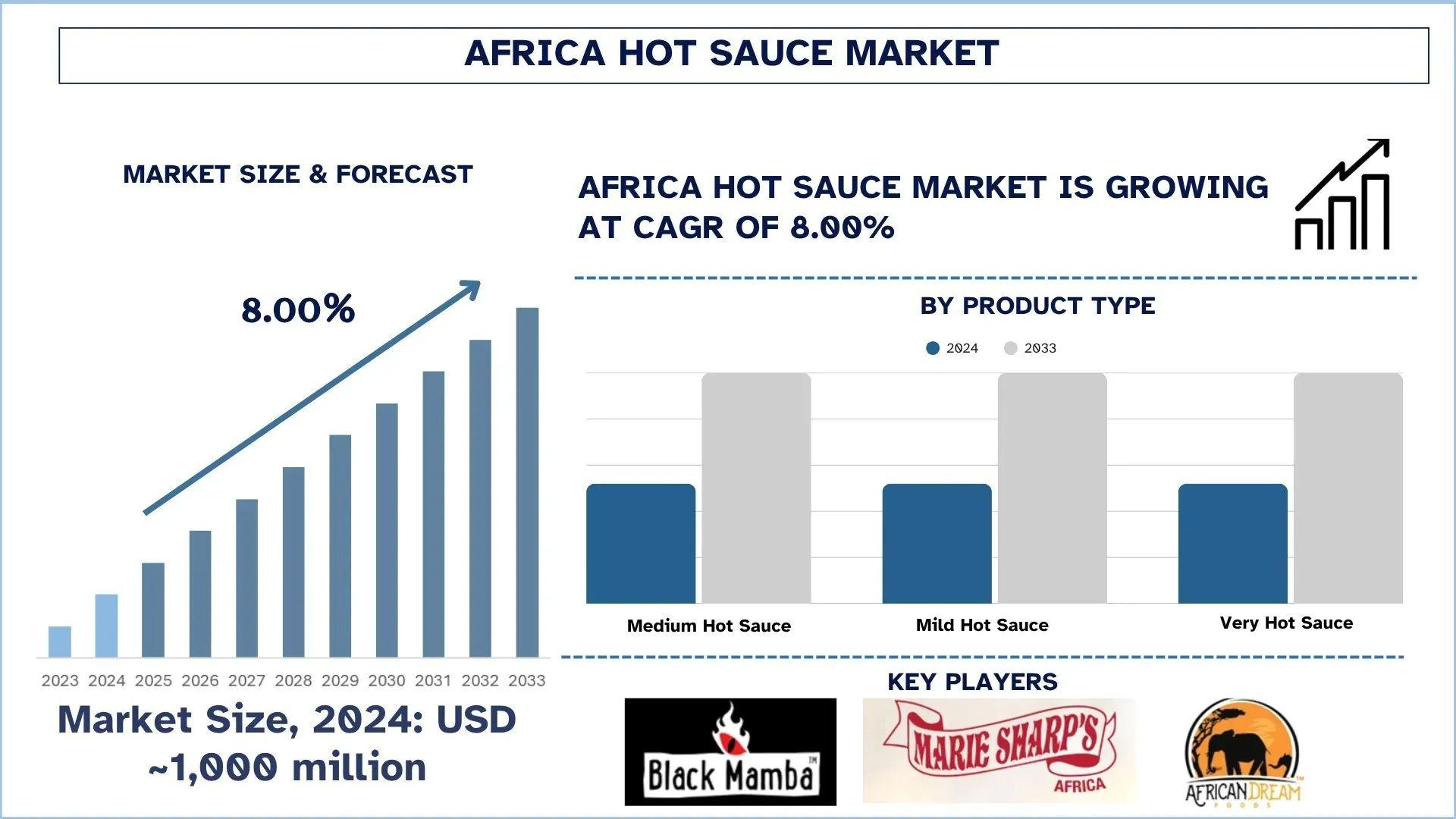 According to UnivDatos, growing demand for spicy/ethnic flavors among consumers, and the Expansion of foodservice/quick-service restaurants (QSRs) and street-food culture have led to the market rise. As per their “Africa Hot Sauce Market” report, the Africa market was valued at USD 1,000 million in 2024, growing at a CAGR of about 8.00% during the forecast period from 2025 - 2033 to reach USD million by 2033.