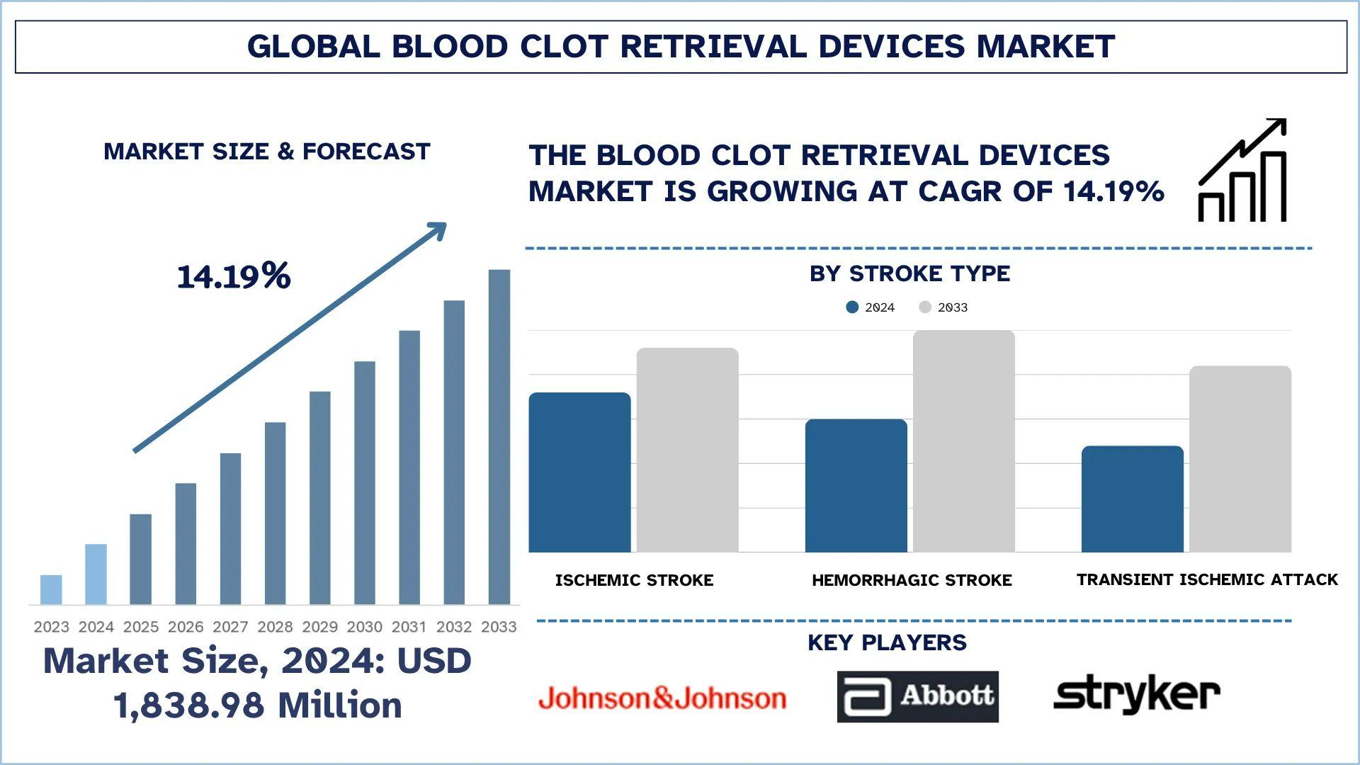 According to UnivDatos analysis, the rising incidence of ischemic stroke and other thrombotic disorders, and increasing awareness and adoption of minimally invasive thrombectomy procedures are the major factors driving the growth of the Blood Clot Retrieval Devices market. As per their “Blood Clot Retrieval Devices Market” report, the global market was valued at USD 1,838.98 million in 2024, growing at a CAGR of about 14.19% during the forecast period from 2025 - 2033 to reach USD million by 2033.