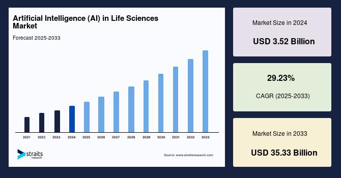 The Artificial Intelligence (AI) in Life Sciences Market is transforming the global healthcare and biotechnology landscape by enabling faster drug discovery, precision medicine, advanced diagnostics, and operational efficiency across the value chain. AI technologies such as machine learning, deep learning, and natural language processing are increasingly embedded in research, clinical development, medical imaging, and patient management systems. This article provides a comprehensive and SEO-optimized overview of the market, strictly based on insights from Straits Research.