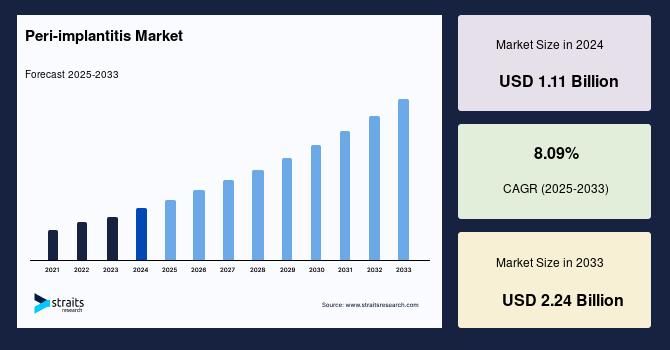 According to StraitsResearch, the global peri implantitis market size is valued at USD 1.11 billion in 2024 and is estimated to reach USD 2.24 billion by 2033, growing at a CAGR of 8.09% during 2025-2033.