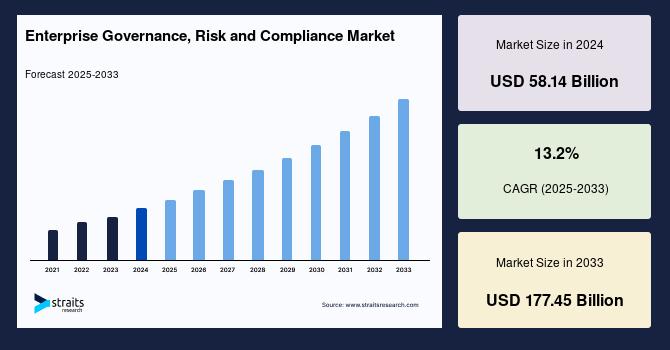 According to StraitsResearch, the global enterprise governance risk and compliance market size is valued at USD 58.14 billion in 2024 and is estimated to reach USD 177.45 billion by 2033, growing at a CAGR of 13.2% during 2025-2033.