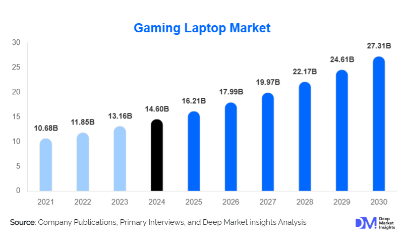 According to Deep Market Insights, the global Gaming Laptop Market size is projected to grow from USD 16.21 Billion in 2025 to reach USD 27.31 Billion by 2030, expanding at a CAGR of 11% during the forecast period (2025–2030).