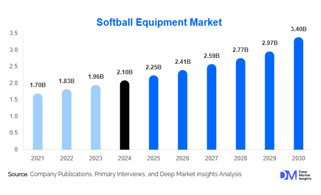 According to Deep Market Insights, the global Softball Equipment Market size is projected to grow from USD 2.25 Billion in 2025 to reach USD 3.4 Billion by 2030, expanding at a CAGR of 7.2% during the forecast period (2025–2030).