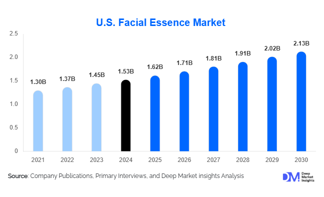 According to Deep Market Insights, the global U.S. Facial Essence Market size is projected to grow from USD 1.62 Billion in 2025 to reach USD 2.13 Billion by 2030, expanding at a CAGR of 5.63% during the forecast period (2025–2030).