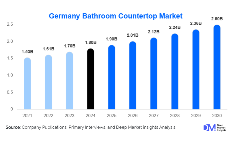 According to Deep Market Insights, the global Germany Bathroom Countertop Market size is projected to grow from USD 1.9 Billion in 2025 to reach USD 2.5 Billion by 2030, expanding at a CAGR of 5.6% during the forecast period (2025–2030).