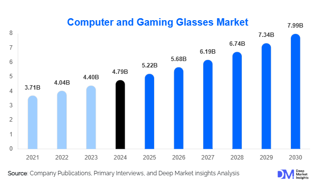 According to Deep Market Insights, the global Computer and Gaming Glasses Market size is projected to grow from USD 5.22 Billion in 2025 to reach USD 7.99 Billion by 2030, expanding at a CAGR of 8.9% during the forecast period (2025–2030).