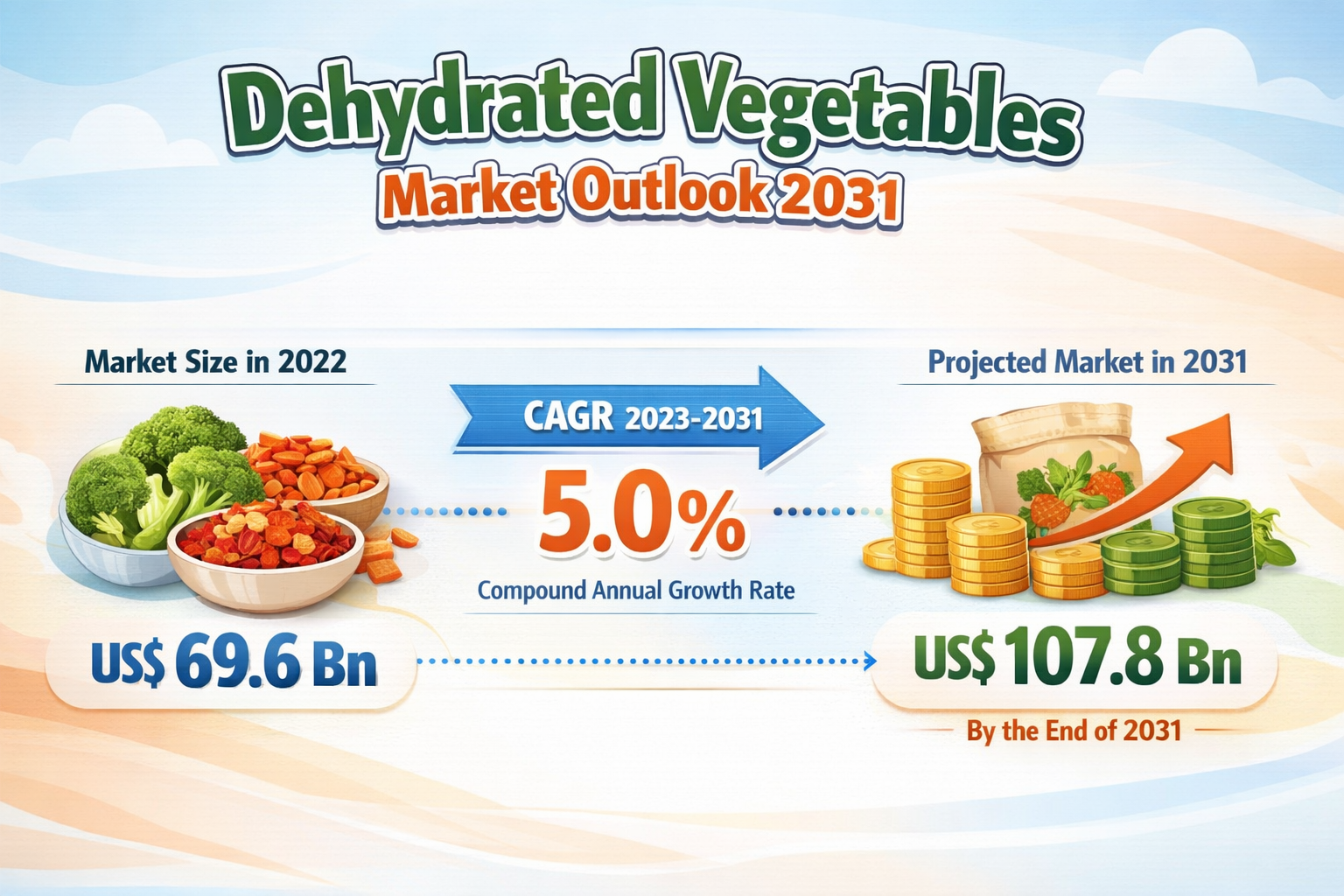 The global Dehydrated Vegetables Market is witnessing remarkable growth, fueled by the rising demand for processed food products, increasing health awareness among consumers, and expanding applications across multiple food industries. As consumers seek convenient, nutritious, and long-lasting food options, dehydrated vegetables have emerged as a reliable solution. The market, which was valued at US$ 69.6 billion in 2022, is projected to reach approximately US$ 107.8 billion by 2031, registering a steady compound annual growth rate (CAGR) of 5.0% from 2023 to 2031. This growth is largely driven by advancements in food preservation technologies and evolving global food consumption patterns.