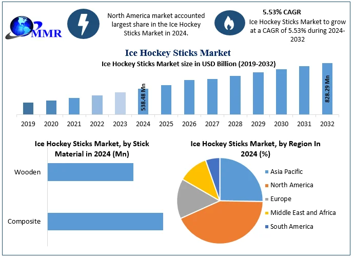 Ice Hockey Sticks Market size was valued at USD 538.48 Mn in 2024 and is expected to reach USD 828.29 Mn by 2032, at a CAGR of 5.53 % from forecast 2025 to 2032.