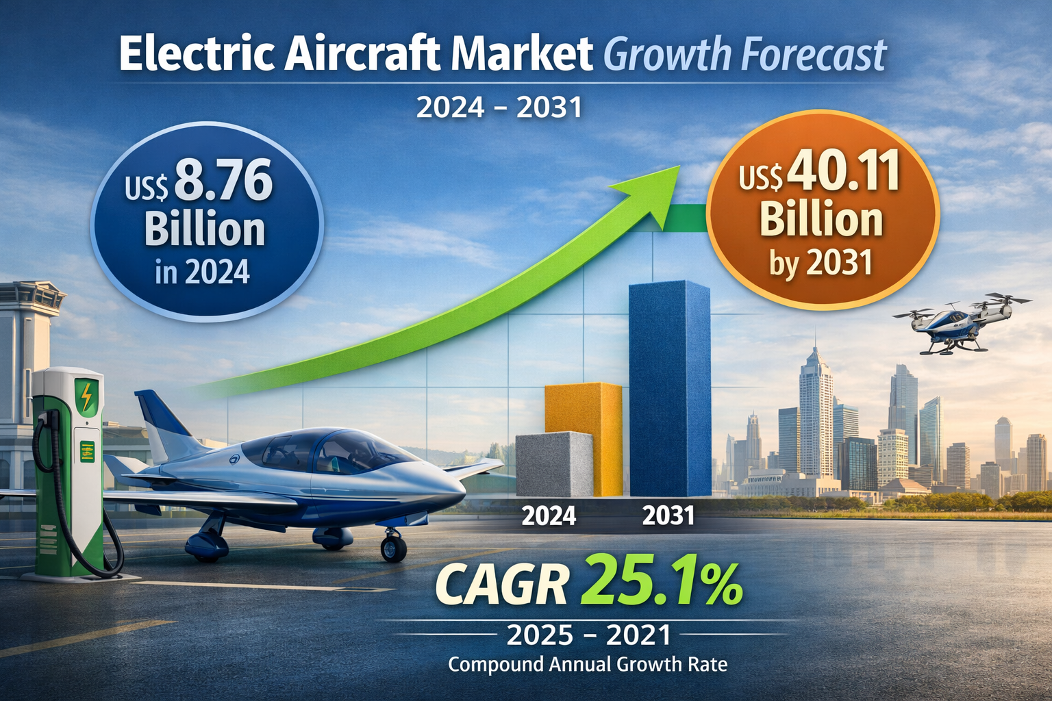 The electric aircraft market was valued at US$ 8.76 billion in 2024 and is projected to reach US$ 40.11 billion by 2031, registering a CAGR of 25.1% during the forecast period (2025–2031).The market is gaining significant momentum as the global aviation industry shifts toward sustainable and energy-efficient technologies. Increasing environmental concerns, stricter emission regulations, and advancements in electric propulsion systems are encouraging aerospace companies to invest heavily in electric aviation solutions.