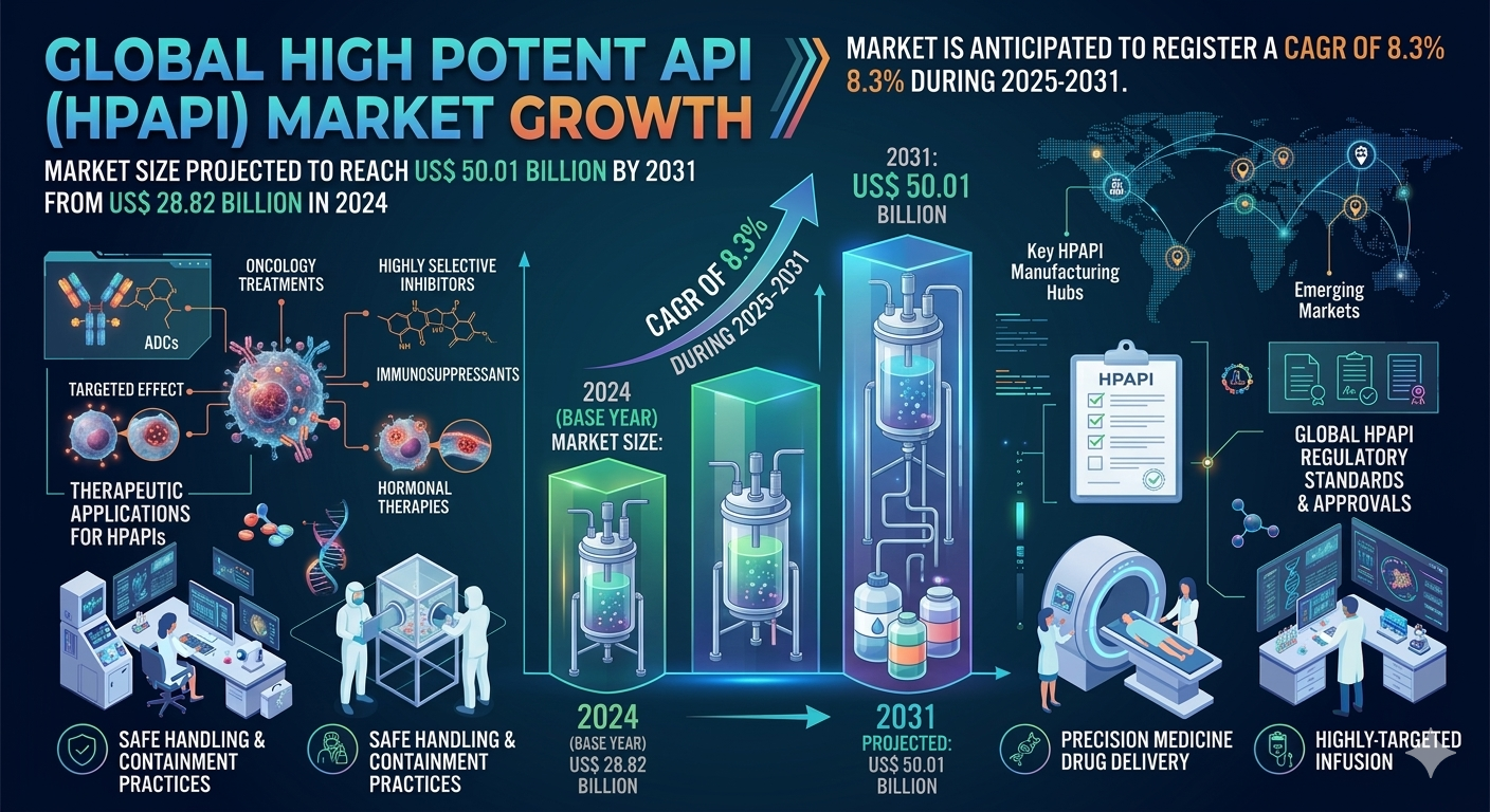 According to market research insights, the global High Potent API market was valued at US$ 28.82 billion in 2024 and is projected to reach US$ 50.01 billion by 2031, growing at a CAGR of 8.3% during 2025–2031. The market growth is primarily driven by increasing cancer prevalence, rising investments in biotechnology research, and the growing adoption of highly potent compounds in next-generation drug development. Pharmaceutical manufacturers are also investing in advanced containment systems and high-precision production facilities to ensure safe handling and production of HPAPIs.