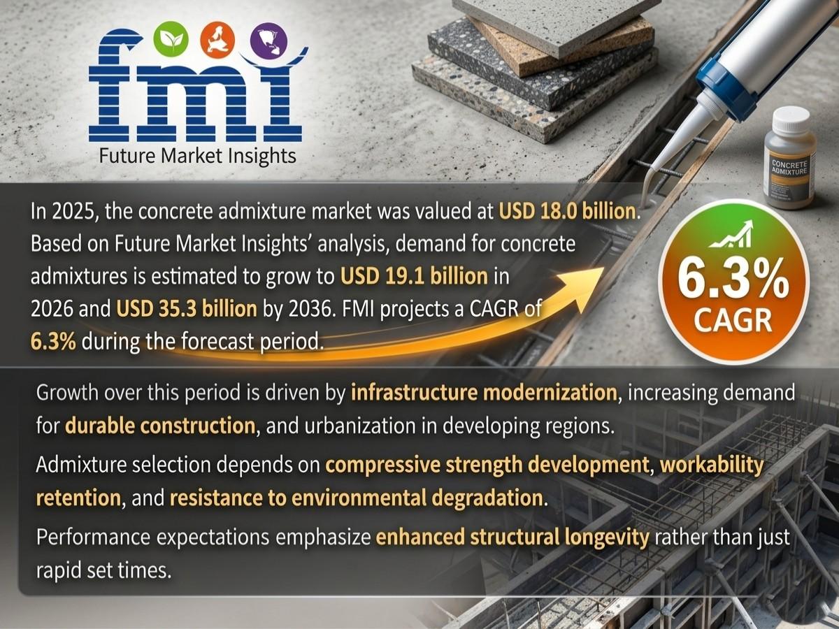 The global concrete admixtures market is projected to witness significant growth over the next decade, supported by rapid infrastructure development, urbanization, and increasing demand for high-performance construction materials. The market is expected to grow from approximately USD 19.1 billion in 2026 to nearly USD 35.3 billion by 2036, registering a CAGR of 6.3%, according to the latest analysis by Future Market Insights (FMI).