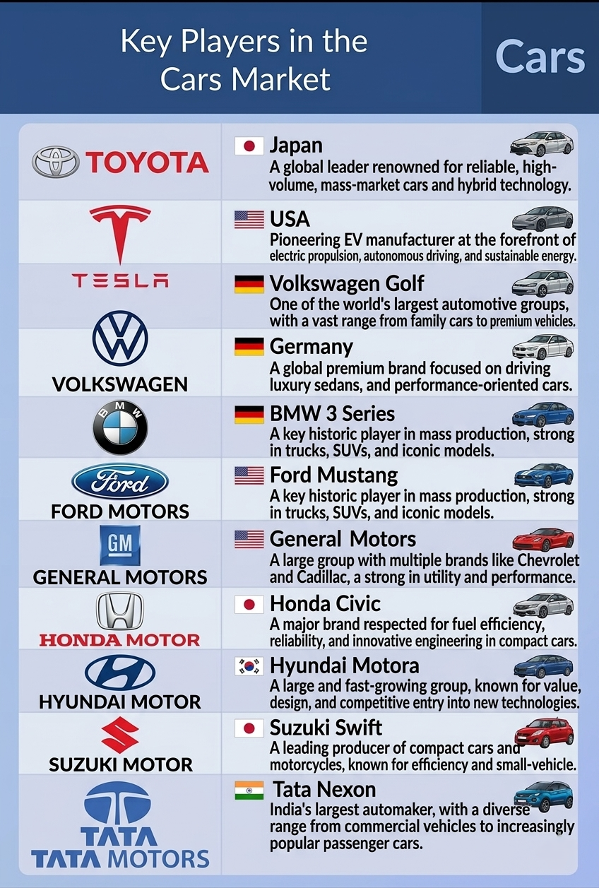 Leading automakers are competing through product differentiation, expansion of EV portfolios, and adoption of advanced manufacturing technologies. Collaborations with technology firms are also becoming increasingly common to accelerate the development of autonomous and connected vehicle solutions.