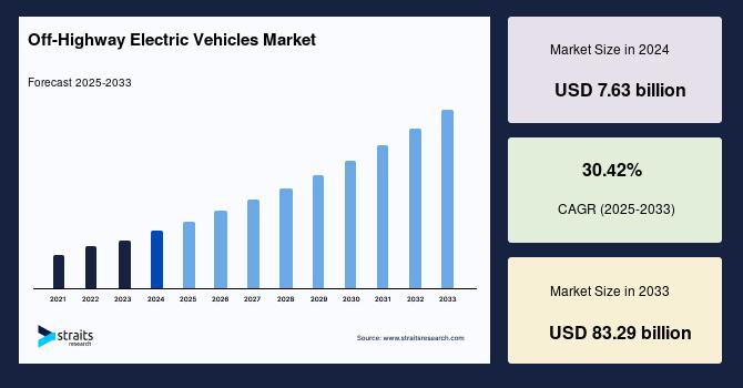 According to StraitsResearch, the global off highway electric vehicles market size was valued at USD 7.63 billion in 2024 and is estimated to reach USD 83.29 billion by 2033, growing at a CAGR of 30.42% during 2025-2033.