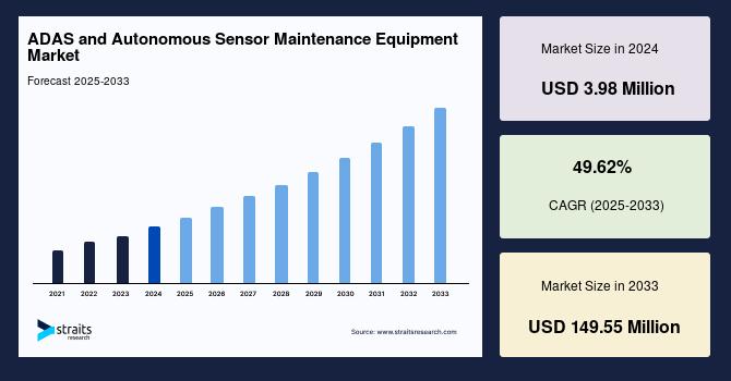 According to StraitsResearch, the global adas and autonomous sensor maintenance equipment market size was valued at USD 3.98 million in 2024 and is estimated to reach USD 149.55 million by 2033, growing at a CAGR of 49.62% during 2025-2033.