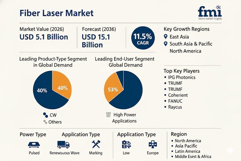 The global Fiber Laser Market is witnessing sustained growth as manufacturers prioritize precision, speed, and automation across production environments. Valued at USD 5.1 billion in 2026, the market is forecast to reach USD 15.1 billion by 2036, registering a CAGR of 11.5%. This expansion is closely tied to rising demand for advanced laser technologies that enhance cutting accuracy, reduce operational downtime, and improve production consistency across industrial sectors.