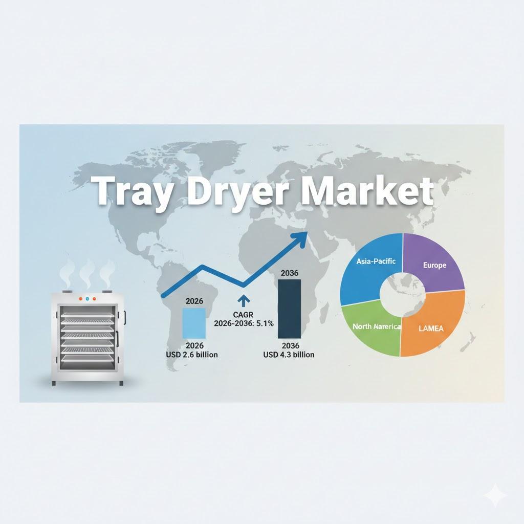 The global Tray Dryer Market is projected to expand from USD 2.6 billion in 2026 to USD 4.3 billion by 2036, reflecting a steady CAGR of 5.1%. The market’s growth trajectory is supported by increasing pharmaceutical manufacturing, rising processed food consumption, and growing demand for consistent moisture removal technologies. With stricter quality standards and sustainability mandates, tray dryers are becoming a strategic asset in modern industrial production.