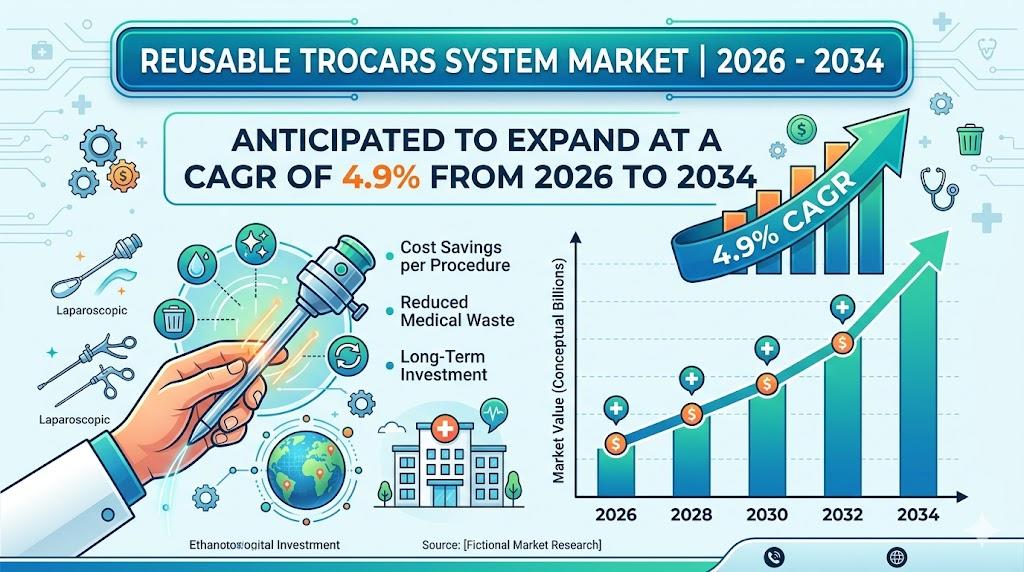 The reusable trocars system market is expected to maintain steady growth over the forecast period. The CAGR of 4.9% from 2026 to 2034 reflects the increasing adoption of minimally invasive surgeries, cost-conscious healthcare practices, and a global emphasis on sustainability.