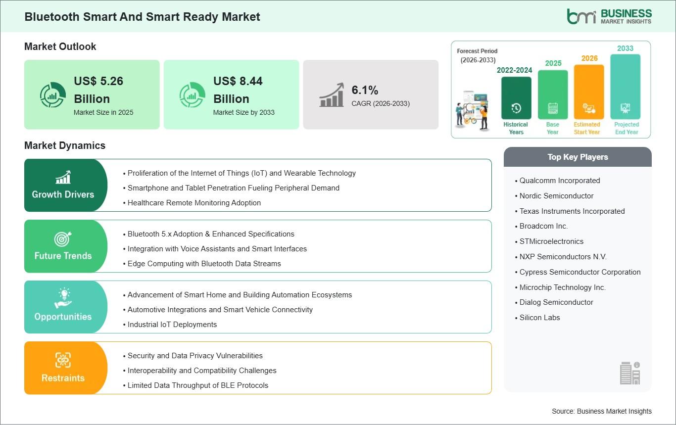 According to the Business Market Insights The Bluetooth Smart and Smart Ready Market is poised for robust expansion, with its size expected to reach US$ 8.44 billion by 2033 from US$ 5.26 billion in 2025 . This growth trajectory reflects a compound annual growth rate ( CAGR ) of 6.10% from 2026 to 2033 , driven by surging demand for low-power connectivity in IoT devices, wearables, and smart home ecosystems. As industries pivot toward energy-efficient wireless solutions, Bluetooth Low Energy (BLE) —the backbone of Bluetooth Smart technology—continues to dominate, enabling seamless data transfer in battery-constrained applications.