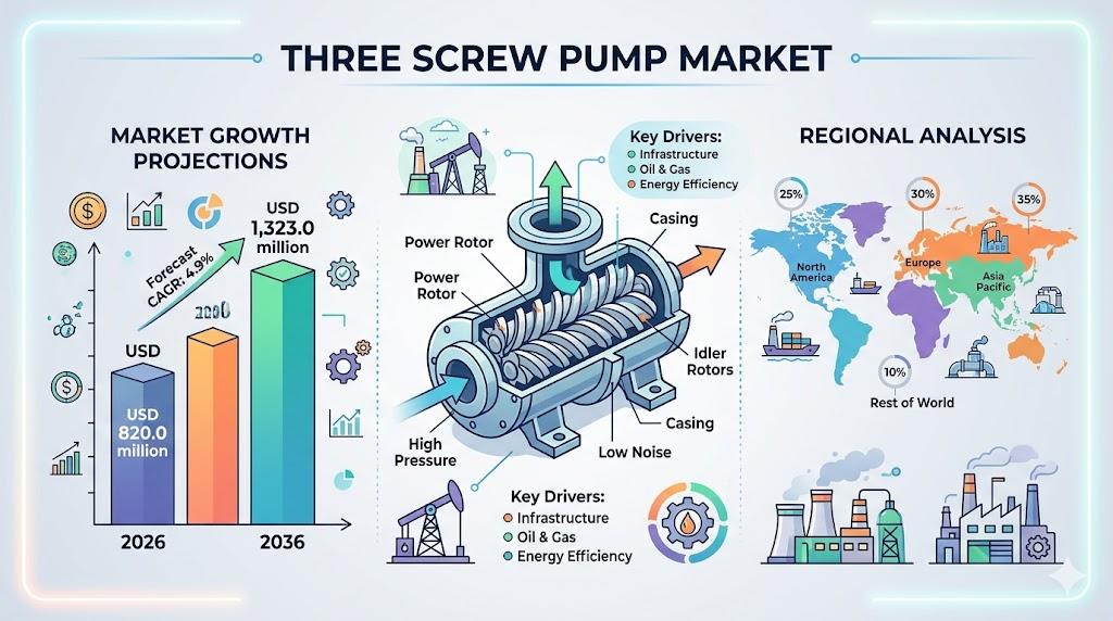 The Three Screw Pump Market is projected to grow from USD 820.0 million in 2026 to USD 1,323.0 million by 2036, expanding at a CAGR of 4.9%, according to recent market analysis. Growth remains steady and reliability-driven, supported by continuous demand from energy, marine, power generation, and heavy industrial sectors where operational stability is mission-critical.
