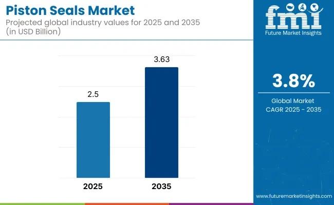 The global Piston Seals Market is poised for consistent growth, projected to expand from USD 2.5 billion in 2025 to USD 3.63 billion by 2035, registering a CAGR of 3.8%. The surge is driven by accelerating industrial automation, rising adoption of electric vehicles (EVs), and increasing demand for high-performance sealing solutions across critical sectors such as aerospace, automotive, and heavy machinery.