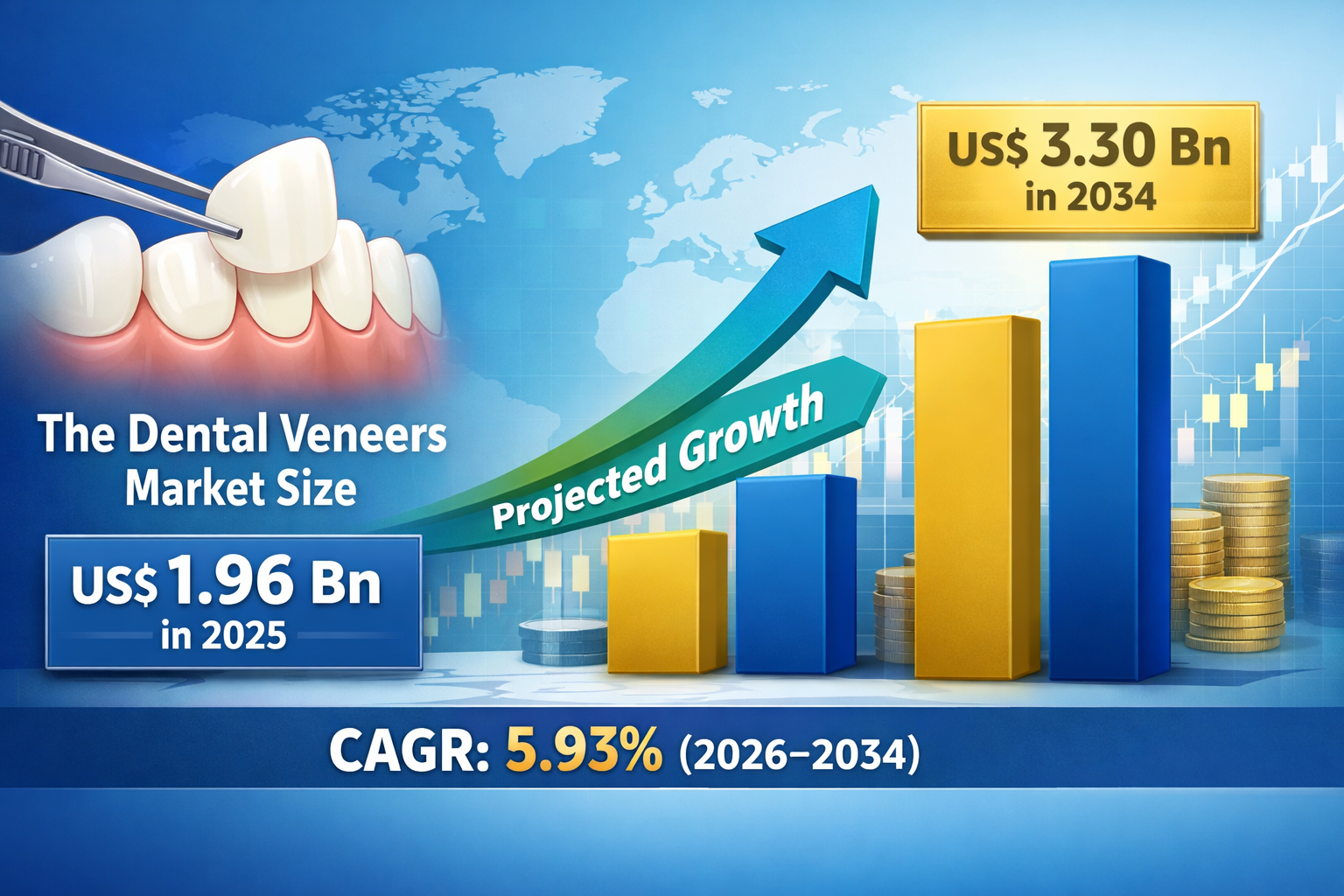 According to market projections, the dental veneers market size is expected to reach US$ 3.30 billion by 2034, up from US$ 1.96 billion in 2025. This growth reflects a steady compound annual growth rate (CAGR) of 5.93% during the forecast period from 2026 to 2034. The consistent expansion is supported by a growing patient pool seeking cosmetic dental treatments and increasing investments in dental infrastructure across North America.