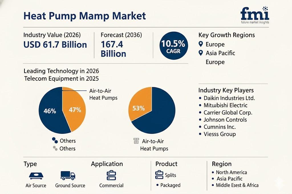The Heat Pump Market is poised for significant expansion, with revenues projected to reach USD 61.7 billion in 2026 and climb to USD 167.4 billion by 2036 at a CAGR of 10.5%. Growth is being driven by increasing electrification of building heating systems, the transition away from fossil fuel-based heating, and stricter energy efficiency targets in major economies. Policy-driven decarbonization programs and utility incentives are accelerating adoption in both new installations and retrofit projects, particularly in residential applications where heat pumps are rapidly becoming the preferred primary heating solution.
