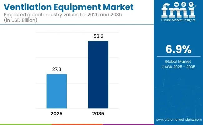 The Ventilation Equipment Market is experiencing strong growth as governments, industries, and homeowners increasingly focus on indoor air quality (IAQ) and energy efficiency. Global sales were valued at USD 19.6 billion in 2020 and are projected to reach USD 27.3 billion by 2025. Between 2025 and 2035, the market is expected to grow at a CAGR of 6.9%, with smart systems and energy-efficient solutions driving sustained adoption across residential, commercial, and industrial sectors.
