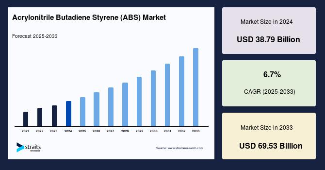 According to StraitsResearch, the global acrylonitrile butadiene styrene market size was valued at USD 38.79 billion in 2024 and is estimated to reach USD 69.53 billion by 2033, growing at a CAGR of 6.7% during 2025-2033.