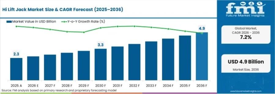 The global Hi Lift Jack Market is witnessing steady expansion, supported by the rapid rise in off-road vehicle ownership, DIY repair trends, and improved online accessibility. According to Future Market Insights (FMI), the market was valued at USD 2.30 billion in 2025 and is projected to reach USD 2.47 billion in 2026, ultimately climbing to USD 4.94 billion by 2036. This growth trajectory reflects a robust CAGR of 7.20% between 2026 and 2036, generating an absolute dollar opportunity of approximately USD 2.48 billion.