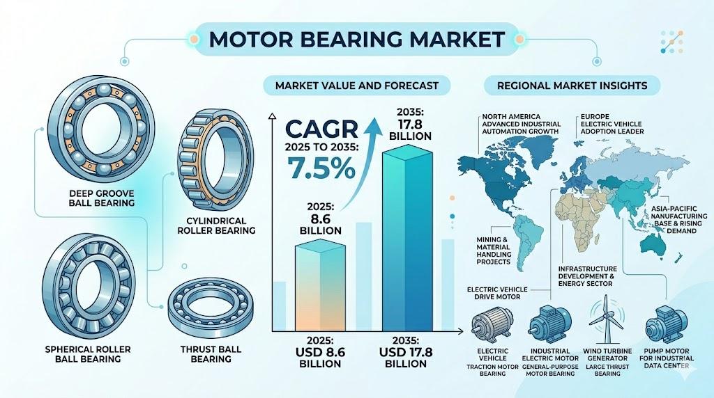 The global Motor Bearing Market is witnessing steady expansion as industries prioritize energy-efficient motors, electrification technologies, and automated production systems. According to industry analysis, the market is projected to grow from USD 8.6 billion in 2025 to nearly USD 17.8 billion by 2035, registering a CAGR of 7.5% during the forecast period.