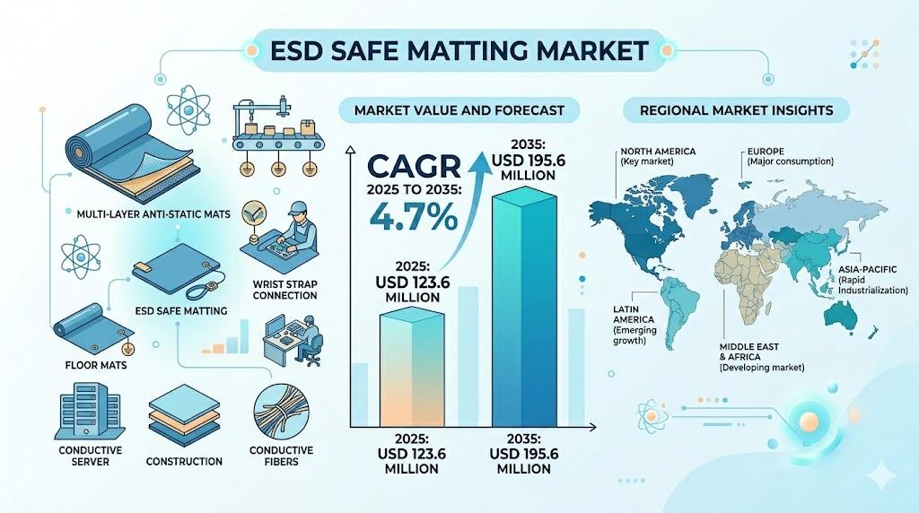 The ESD safe matting market is positioned for stable expansion as industries adopt higher safety and compliance standards.