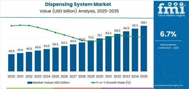 The global Dispensing System Market is set for robust expansion, projected to grow from USD 56.5 billion in 2025 to USD 108.1 billion by 2035, registering a steady CAGR of 6.7%. This growth trajectory reflects increasing adoption of precision dispensing technologies across electronics, automotive, and pharmaceutical industries, where accuracy, repeatability, and efficiency are becoming critical operational requirements.