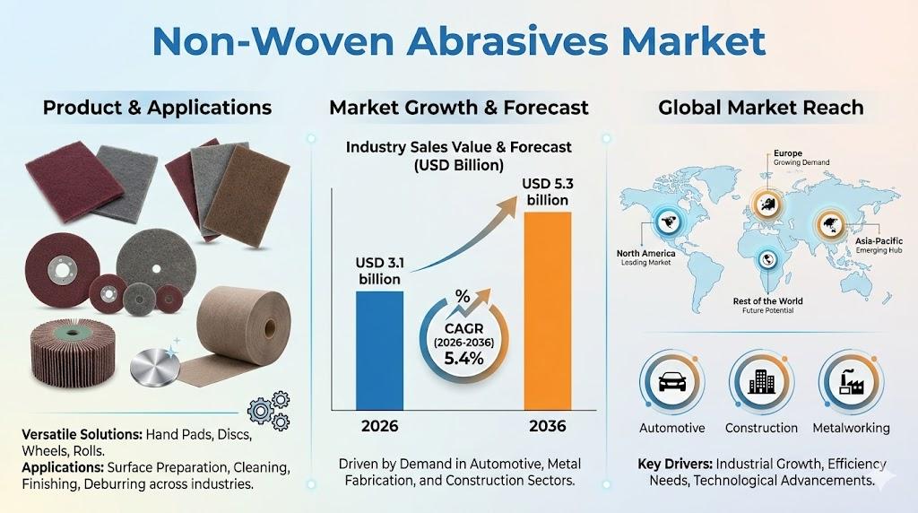 The Non-Woven Abrasives Market is demonstrating resilient, growth-oriented momentum as industries prioritize surface quality, operational efficiency, and precision manufacturing. According to recent market analysis, the industry is forecast to expand from USD 3.1 billion in 2026 to USD 5.3 billion by 2036, reflecting a CAGR of 5.4% over the ten-year period. This growth positions non-woven abrasives as a critical component within the broader abrasives and industrial finishing ecosystem.