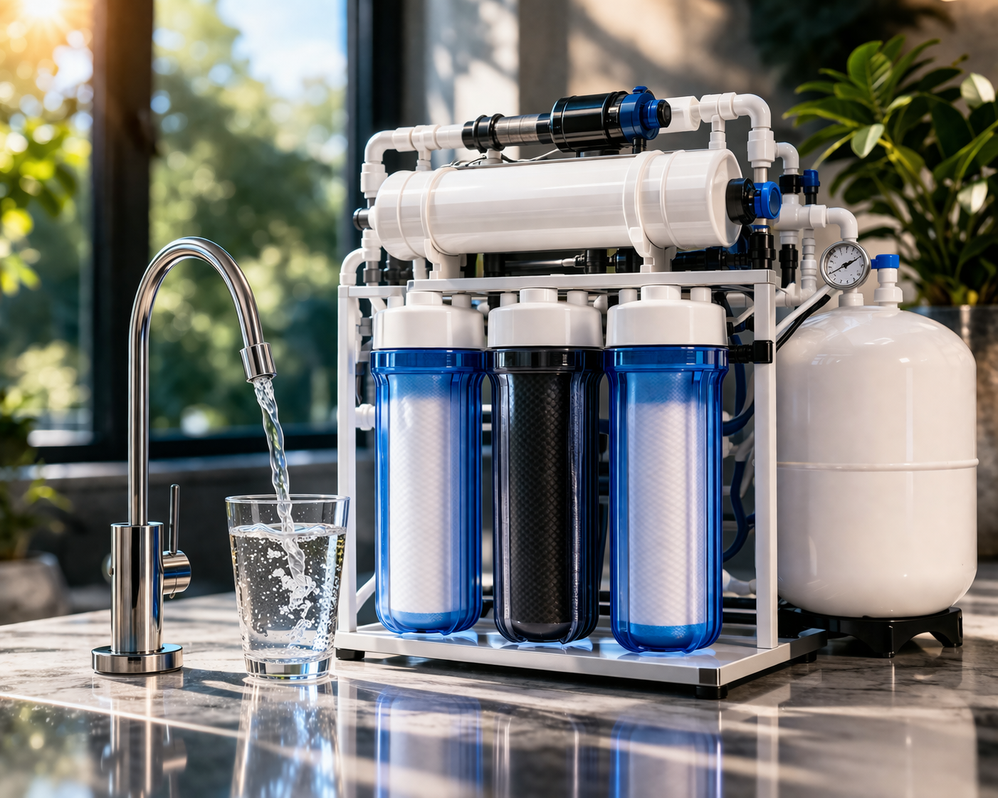 This is the main stage. The membrane removes dissolved salts, bacteria, and chemicals.