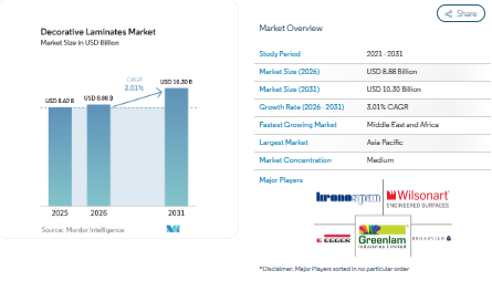 Decorative Laminates Market Size to Hit USD 10.30 Billion by 2031, Expanding at 3.01% CAGR (2026-2031)