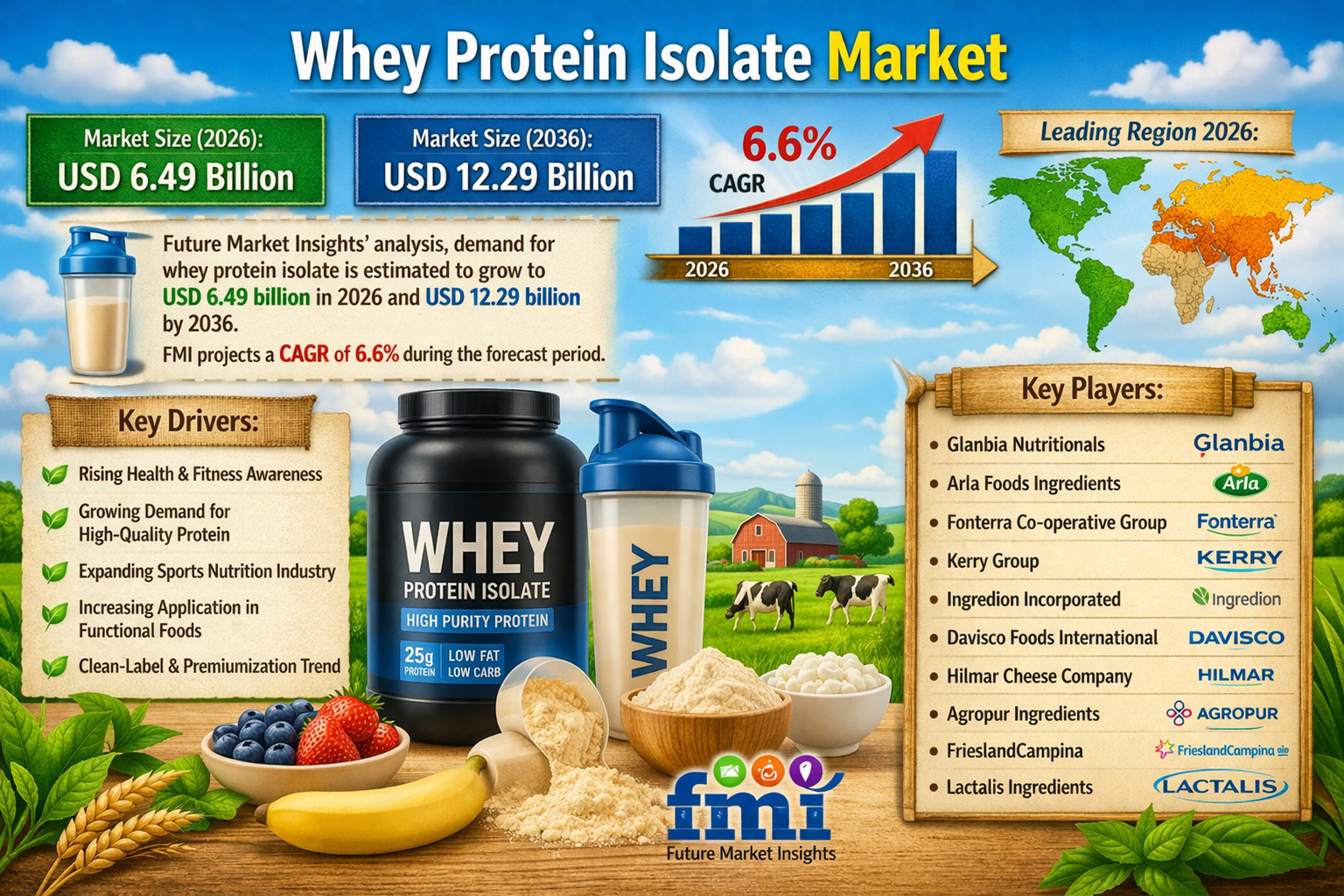 NEWARK, DE, United States – April 6, 2026 – The global whey protein isolate (WPI) market is undergoing a significant transformation, evolving from a core sports nutrition ingredient into a high-value component across pharmaceutical nutrition, infant formula, and functional food applications. According to the latest strategic outlook by Future Market Insights (FMI), the whey protein isolate market—valued at USD 6.09 billion in 2025—is projected to reach USD 6.49 billion in 2026 and further expand to USD 12.29 billion by 2036, registering a CAGR of 6.6% during the forecast period.