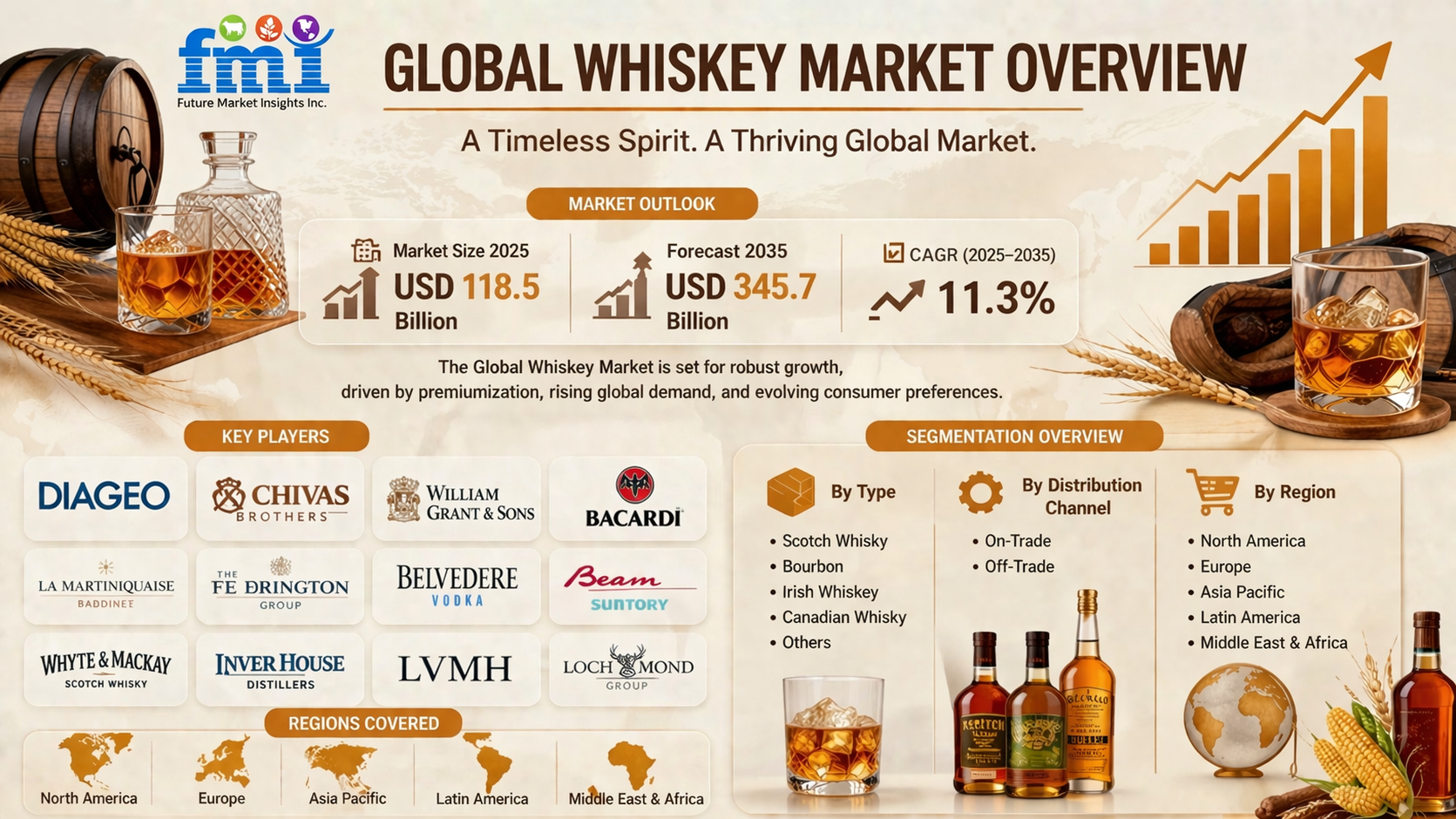NEWARK, Del., USA | April 7, 2026 — According to the latest market analysis by Future Market Insights, the global whiskey market is entering a dynamic growth phase, driven by premiumization, evolving consumer preferences, and expanding global accessibility. Valued at USD 118.5 billion in 2025, the market is projected to reach USD 345.7 billion by 2035, registering a strong CAGR of 11.3%. As consumer demand shifts toward high-quality, experiential, and innovative spirits, whiskey is transforming from a traditional beverage into a globally diversified lifestyle product.