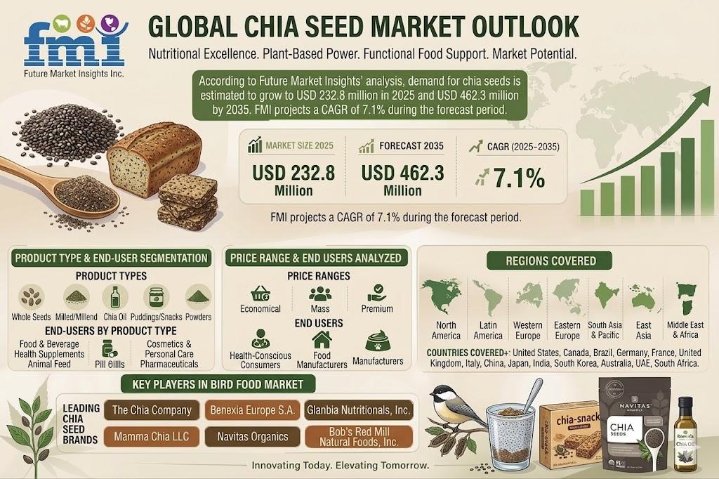 NEWARK, Del., USA | April 8, 2026 — According to the latest market analysis by Future Market Insights, the global chia seed market is witnessing steady expansion, driven by rising consumer preference for nutrient-dense superfoods, clean-label products, and plant-based nutrition. The market is projected to grow from USD 232.8 million in 2025 to USD 462.3 million by 2035, registering a CAGR of 7.1% during the forecast period.