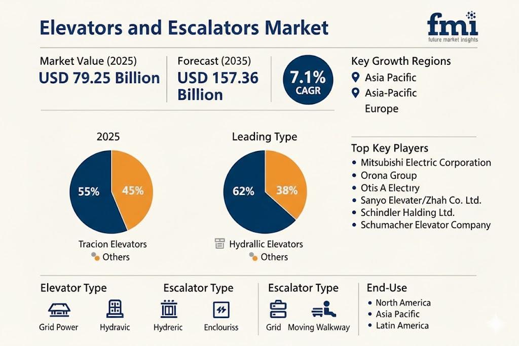 The global elevators and escalators market is projected to grow from USD 79.25 billion in 2025 to USD 157.36 billion by 2035, reflecting a CAGR of 7.1%. This expansion is primarily driven by rapid urbanization, high-rise construction, and smart city initiatives across Asia-Pacific, the Middle East, and Latin America.