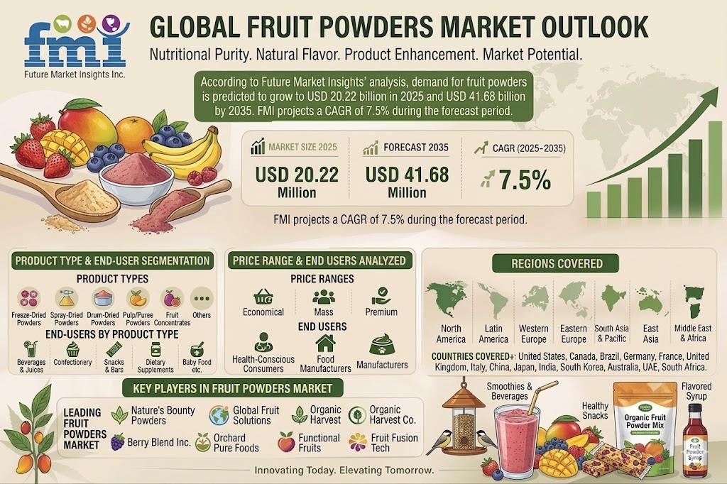 NEWARK, Del., USA | April 9, 2026 — According to the latest market analysis by Future Market Insights, the global fruit powders market is witnessing strong growth momentum, driven by rising demand for natural, minimally processed ingredients and clean-label food solutions. The market is projected to expand from USD 20.22 billion in 2025 to USD 41.68 billion by 2035, registering a CAGR of 7.5% during the forecast period.