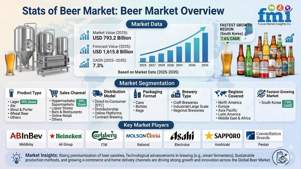 The global beer market is poised for steady expansion, projected to grow from USD 793.2 billion in 2025 to USD 1,615.8 billion by 2035, registering a CAGR of 7.3% during the forecast period. Growth is driven by rising demand for craft, low-alcohol, and non-alcoholic beer variants, alongside continuous innovation in brewing technologies. Evolving consumer preferences toward premium, sustainable, and health-conscious beverages are reshaping the global beer landscape.