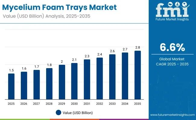 The mycelium foam trays market is rapidly transitioning from experimental bio-material innovation to a commercially scalable packaging solution. Valued at USD 1.5 billion in 2025, the market is forecast to reach USD 2.8 billion by 2035, expanding at a CAGR of 6.6%. This growth reflects a decisive shift by food producers, retailers, and logistics operators away from petroleum-based foams such as EPS and PU, toward naturally grown, compostable alternatives. Across Asia-Pacific, Europe, and North America, mycelium foam trays are gaining traction for their lightweight structure, thermal insulation, and end-of-life compostability. What was once viewed as a niche sustainability concept is now becoming a core material strategy as global brands align packaging decisions with regulatory pressure, circular economy targets, and consumer expectations for plastic-free solutions.
