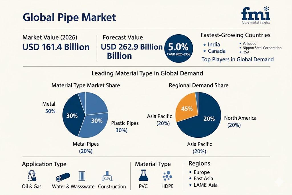 The global Pipe Market is entering a decade of structured and predictable expansion, supported by essential infrastructure development rather than short-term construction cycles. Valued at USD 161.4 billion in 2026, the market is projected to reach USD 262.9 billion by 2036, registering a CAGR of 5.0%. This growth trajectory reflects sustained capital deployment toward water distribution systems, energy transport corridors, and industrial utility networks across both mature and emerging economies.