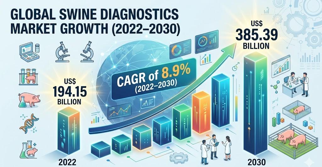 The Europe Swine Diagnostics Market is expanding steadily as part of the broader global industry, which is projected to grow from US$ 194.15 billion in 2022 to US$ 385.39 billion by 2030, registering a CAGR of 8.9% during the forecast period. Within this global expansion, Europe holds a significant position due to its advanced veterinary infrastructure, strong export-oriented pork industry, and high adoption of molecular diagnostic technologies.