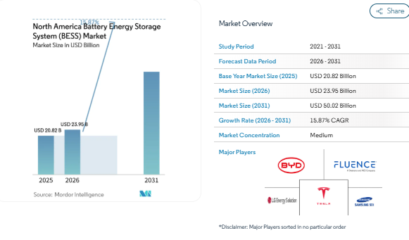 North America Battery Energy Storage System (BESS) Industry to Reach USD 50.02 Billion by 2031 at 15.87% CAGR