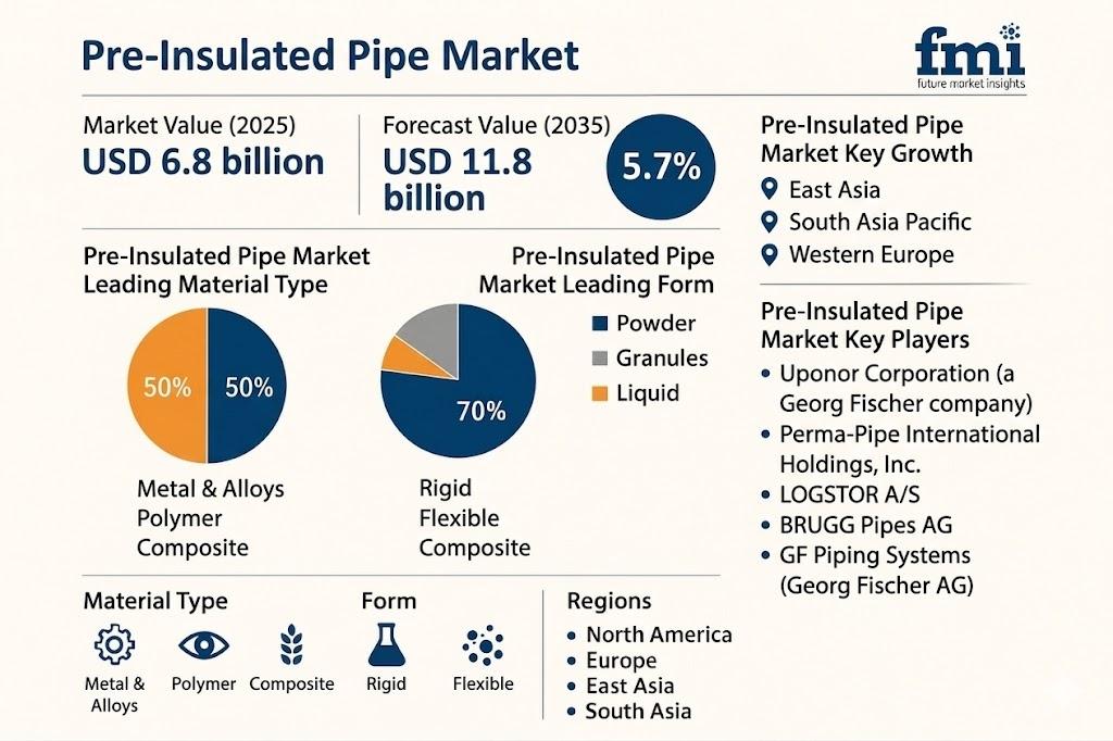 The global Pre-Insulated Pipe Market is witnessing steady and sustained growth, projected to expand from USD 6.8 billion in 2025 to USD 11.8 billion by 2035, registering a CAGR of 5.4%. This growth is underpinned by increasing investments in district heating and cooling networks, along with rising demand for energy-efficient infrastructure across urban and industrial sectors.