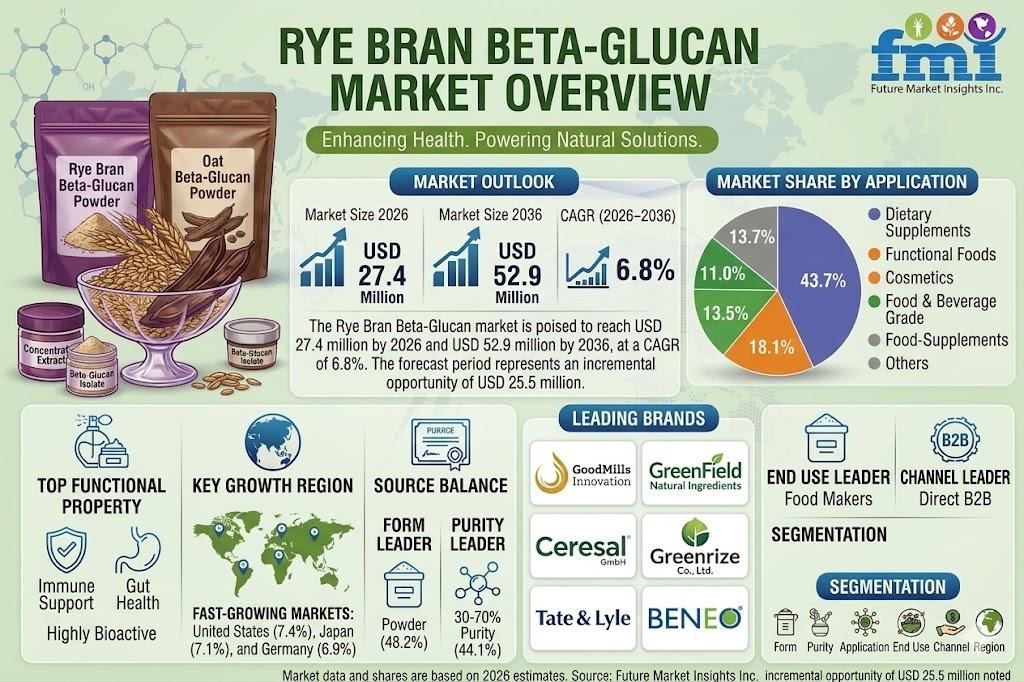 NEWARK, Del., USA | April 21, 2026 — According to the latest market analysis by Future Market Insights (FMI), the global rye bran beta-glucan market is poised for steady expansion, driven by increasing demand for functional dietary fibers, cardiometabolic health solutions, and cost-effective alternatives to oat-derived beta-glucan ingredients.
