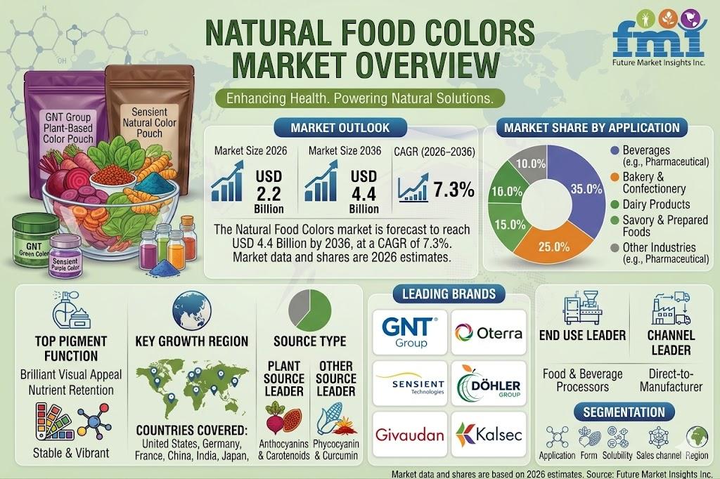 NEWARK, Del., USA | April 21, 2026 — According to the latest analysis by Future Market Insights (FMI), the global natural food colors market is poised for robust expansion as food and beverage manufacturers accelerate the shift away from synthetic dyes. The market, valued at USD 2.0 billion in 2025, is estimated to reach USD 2.2 billion in 2026 and is projected to grow to USD 4.4 billion by 2036, registering a CAGR of 7.3% during the forecast period.